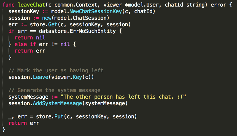 For example, when a user left a chat, we wanted to alert the recipient that they had done so. The server-side code looked like this: