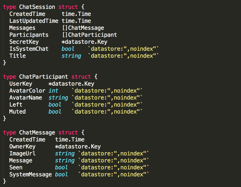 Chat sessions are keyed by simple ids and contain the data above in a single row. Each time a chat is mutated, the server performs a transactional read-modify-write on the row. The transaction is fine so long as write throughput is kept to <= 1 write/sec per entity.