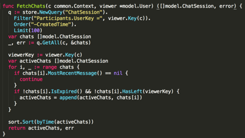 For fast queries for things like showing the user all of their ongoing or previous chats, we created indexes on the participant and created time properties, allowing fast answers for things like “Fetch chats user X is a participant in sorted time in descending order” and locally sorted by last update time. Because chats only lasted 24 hours since the last message exchange, we knew the number of chats would be a reasonably small number to fetch and sort locally on the server (e.g., < 100 in almost every case). If they exceeded that, chances are the user was a bad actor and we could drop some on the floor. That code was simple: